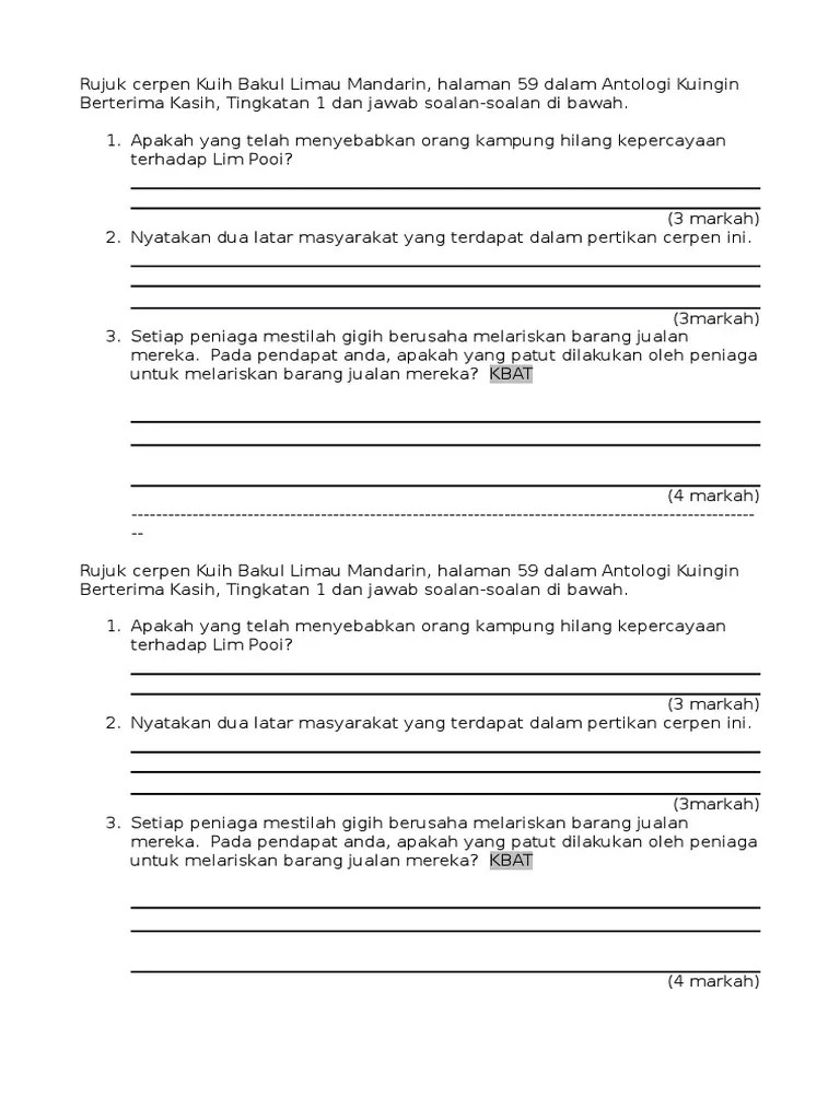 Play this game to review world languages. Dia berpelukan dengan ibunya, sim. Play this game to review other. Sinopsis mengisahkan sim pau, seorang ibu yang gembira apabila menerima panggilan telefon daripada lim meng Komponen sastera dan novel bm / . Praktis pt3 kuih bakul limau mandarin baca cerpen di bawah dengan teliti kemudian . Cerpen kuih bakul limau mandarin (k): Lim pooi amat marah dan tidak menyukainya.